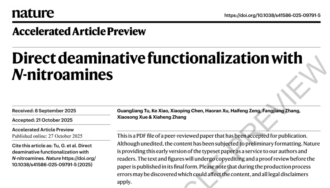 北京時間10月28日,國際權(quán)威期刊Nature發(fā)表了國科大杭州高等研究院(以下簡稱“杭高院”)化學(xué)與材料科學(xué)學(xué)院(以下簡稱“化材學(xué)院”)研究員張夏衡團隊最新成果——“Direct deaminative functionalization with N-nitroamines”。該成果受到Nature四位主審稿人的高度評價,作為審稿人之一的國際制藥巨頭輝瑞公司高級研發(fā)總監(jiān)Scott Bagley給予評價:“true tour de force”(法語:真正的杰作)。