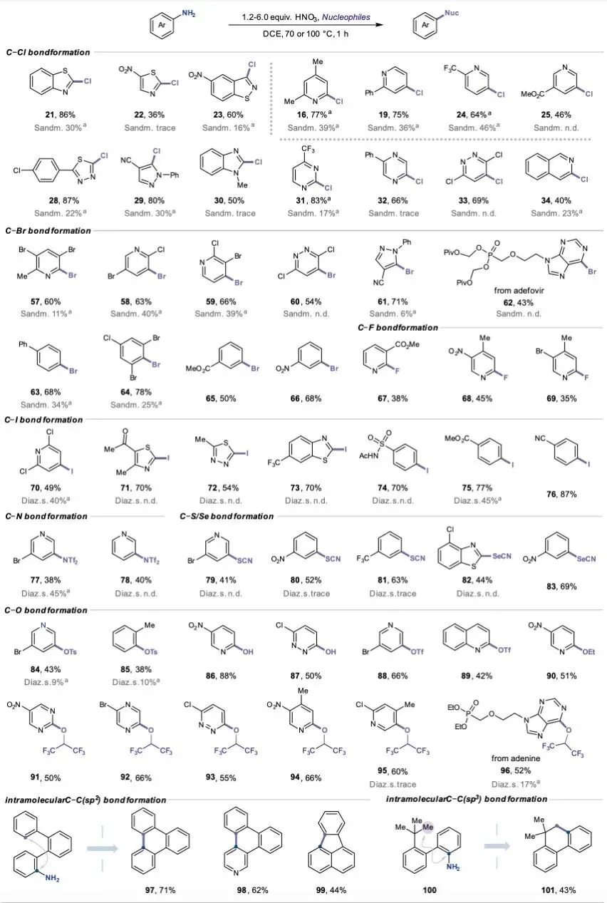 該研究利用芳香胺在硝酸介導(dǎo)下原位形成N-硝胺中間體,隨后通過脫除一氧化二氮(N?O),實現(xiàn)芳香C?N鍵向多種C?X鍵(包括C?Br, C?Cl, C?I, C?F, C?N, C?S, C?Se與C?O)以及C?C鍵的高效直接轉(zhuǎn)化。與經(jīng)典的Sandmeyer反應(yīng)條件相比,新方法在藥物合成中常用的多氮雜環(huán)體系里展現(xiàn)出顯著優(yōu)勢;與其他脫氨官能化方法相比,此策略的核心優(yōu)勢在于僅憑實驗室極易獲取的簡單試劑,就實現(xiàn)了出色的通用性:幾乎適用于所有類型的藥用雜芳胺及電性、結(jié)構(gòu)各異的苯胺衍生物,不受氨基位置限制,并且能夠以簡易操作實現(xiàn)公斤級的規(guī)?;a(chǎn)。