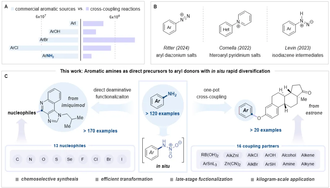 芳香胺作為生物活性分子里極為常見的官能團之一,廣泛存在于藥物、天然產(chǎn)物以及農(nóng)藥等多種化合物結(jié)構(gòu)之中。盡管其在分子構(gòu)建中扮演著重要的結(jié)構(gòu)基石角色,然而將其用作合成砌塊的研究進展卻相對滯后,尚未得到充分開發(fā)。在過去的一個多世紀里,工業(yè)領(lǐng)域通常先將芳香胺轉(zhuǎn)化為名為“重氮鹽”的中間體,進而利用重氮化合物的高反應(yīng)活性開展后續(xù)轉(zhuǎn)化。該分步策略存在諸多弊端,如重氮鹽穩(wěn)定性差、具有爆炸危險性,基于芳基重氮鹽的工藝還面臨化學(xué)計量級銅消耗大、底物兼容性受限等問題。