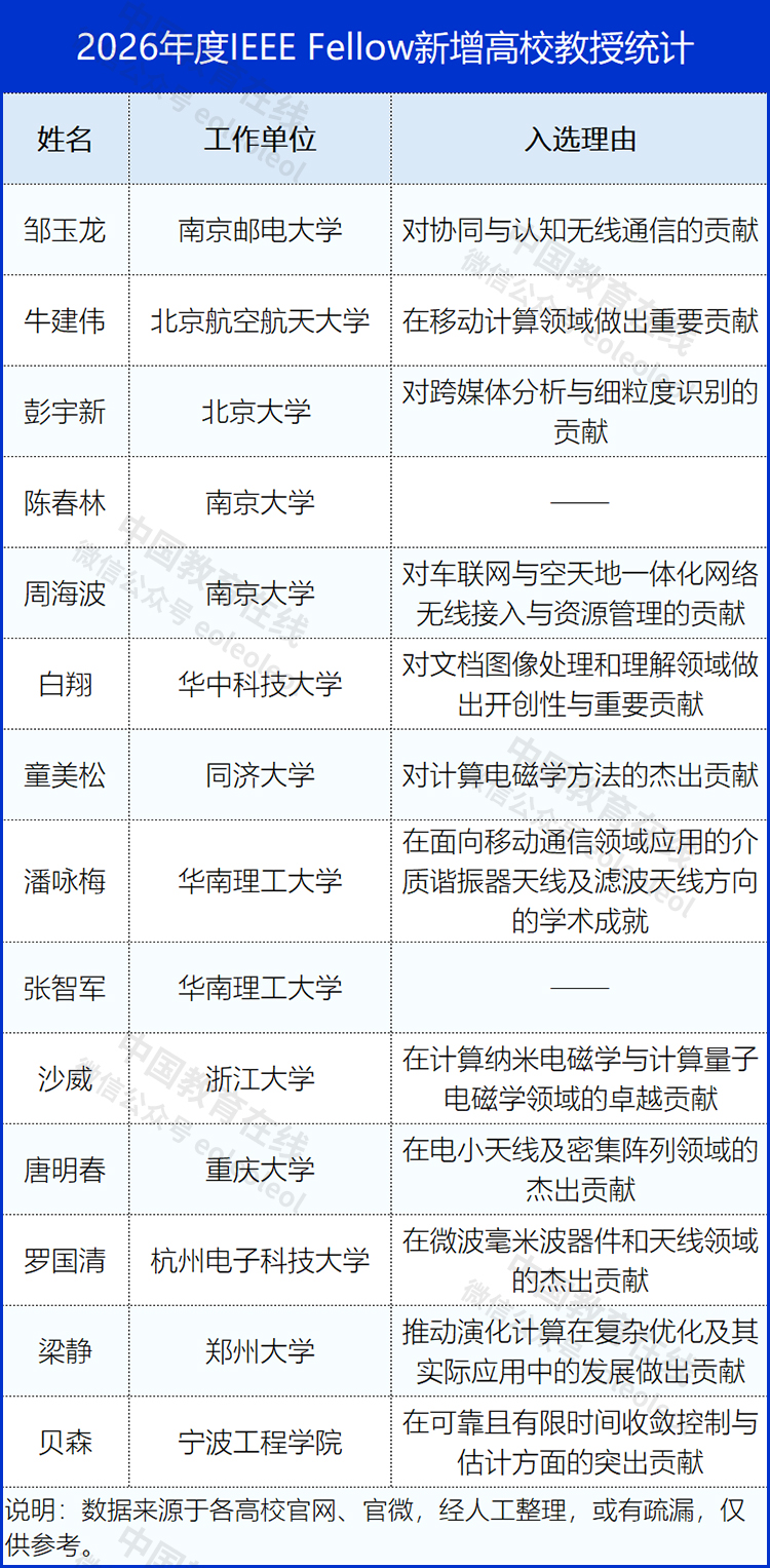 11月27日,國際電氣和電子工程師協會(IEEE)公布2026年度新晉Fellow名單。