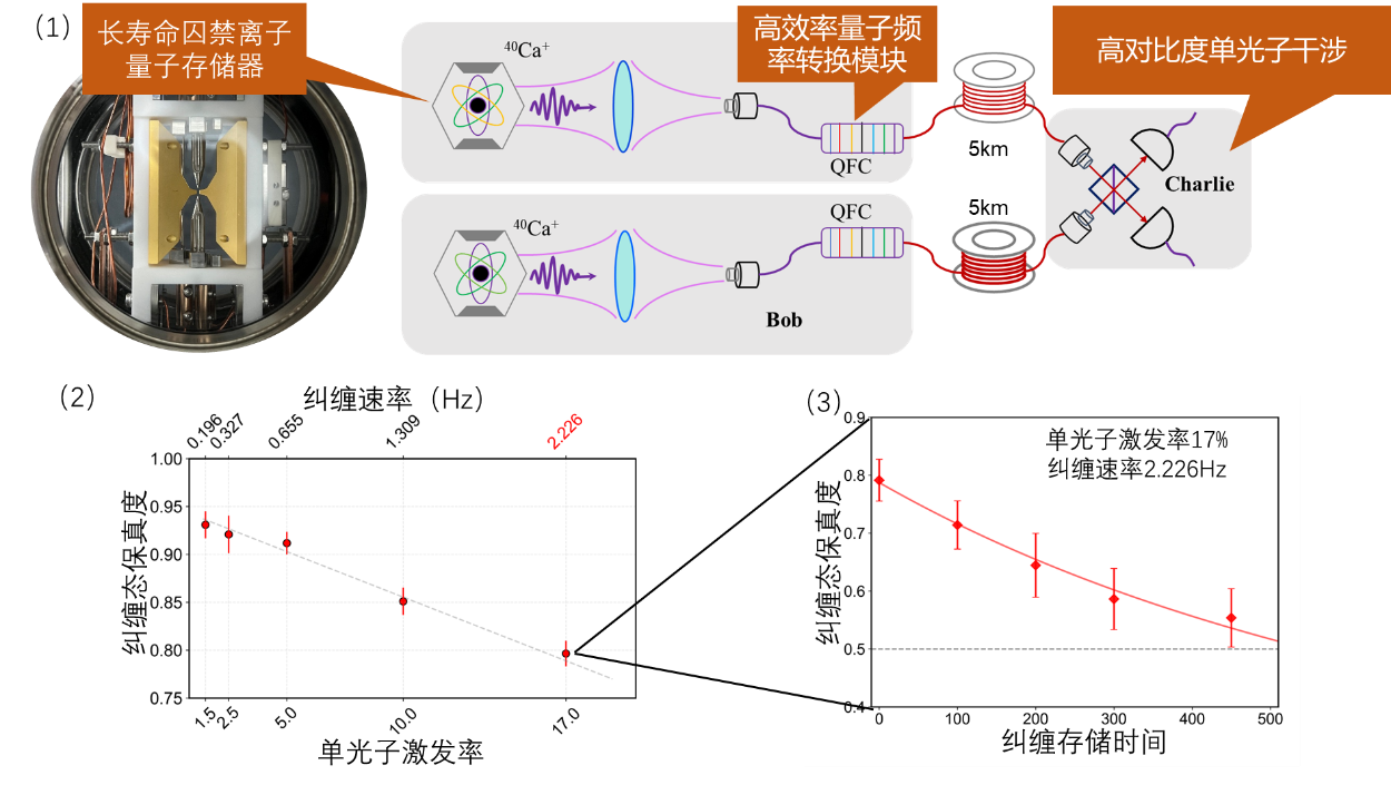 圖3. 可擴展量子中繼的基本模塊原理圖。(1)實驗由長壽命囚禁離子量子儲存器、高效率量子頻率轉換模塊與高對比度單光子干涉模塊組成。(2)糾纏建立速率為2.226赫茲,即等待時間約450毫秒。(3)糾纏壽命約550毫秒。