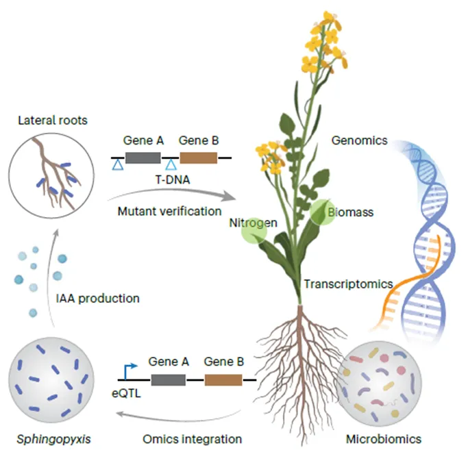 課題組選取了175份具有廣泛遺傳多樣性的甘藍(lán)型油菜種質(zhì),在兩個(gè)典型田間環(huán)境下系統(tǒng)調(diào)查了根系轉(zhuǎn)錄組、根際細(xì)菌16S rRNA譜和植株離子組,構(gòu)建了1341組配對(duì)多組學(xué)數(shù)據(jù)集。通過全基因組關(guān)聯(lián)分析、轉(zhuǎn)錄組關(guān)聯(lián)分析與表達(dá)數(shù)量性狀位點(diǎn)定位,鑒定出203個(gè)具有中高遺傳力的細(xì)菌擴(kuò)增子序列變異,其中多個(gè)ASV與根系氮含量顯著相關(guān)。尤為重要的是,宿主轉(zhuǎn)錄組與微生物組數(shù)據(jù)聯(lián)合解釋了高達(dá)45%的氮吸收自然變異。進(jìn)一步地,鎖定了受宿主強(qiáng)遺傳調(diào)控的關(guān)鍵細(xì)菌屬—鞘氨醇盒菌屬(Sphingopyxis)。通過高通量培養(yǎng)、全基因組測(cè)序與功能驗(yàn)證,證實(shí)該菌能通過合成生長素(IAA)促進(jìn)油菜側(cè)根發(fā)育,從而增強(qiáng)低氮條件下的氮素獲取能力。