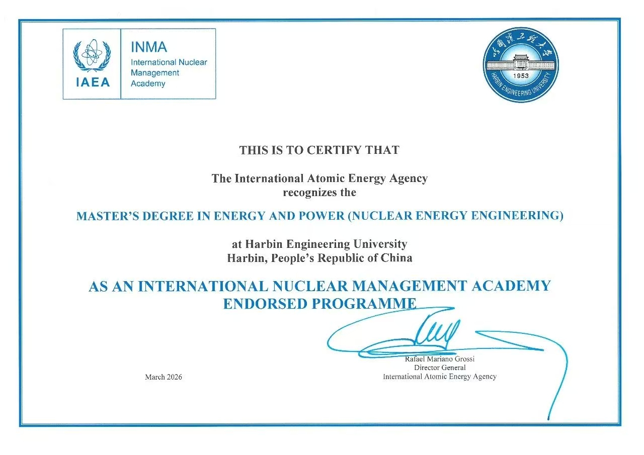 3月25日,國際原子能機(jī)構(gòu)總干事拉斐爾·馬里亞諾·格羅西訪華,在國家原子能機(jī)構(gòu)主任單忠德的見證下,向哈爾濱工程大學(xué)頒發(fā)國際核管理學(xué)院核技術(shù)管理碩士教育認(rèn)證證書,校黨委副書記、校長殷敬偉代表學(xué)校接受證書。哈工程也成為國內(nèi)首個(gè)獲得國際原子能機(jī)構(gòu)國際核管理學(xué)院核技術(shù)管理碩士教育認(rèn)證的高校。