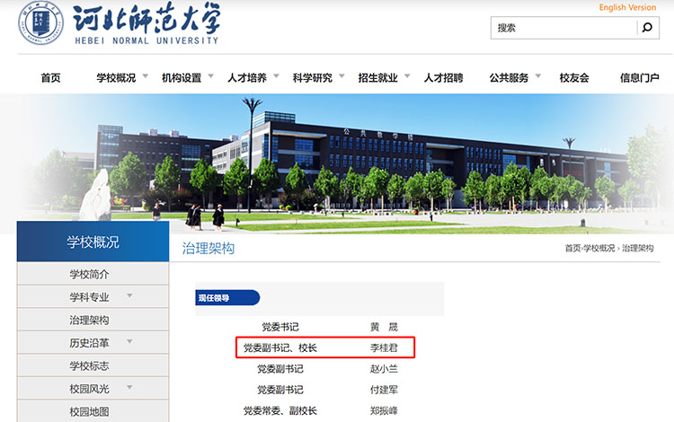 日前,河北師范大學(xué)網(wǎng)站“現(xiàn)任領(lǐng)導(dǎo)”一欄更新后顯示,李桂君已任河北師范大學(xué)黨委副書記、校長。