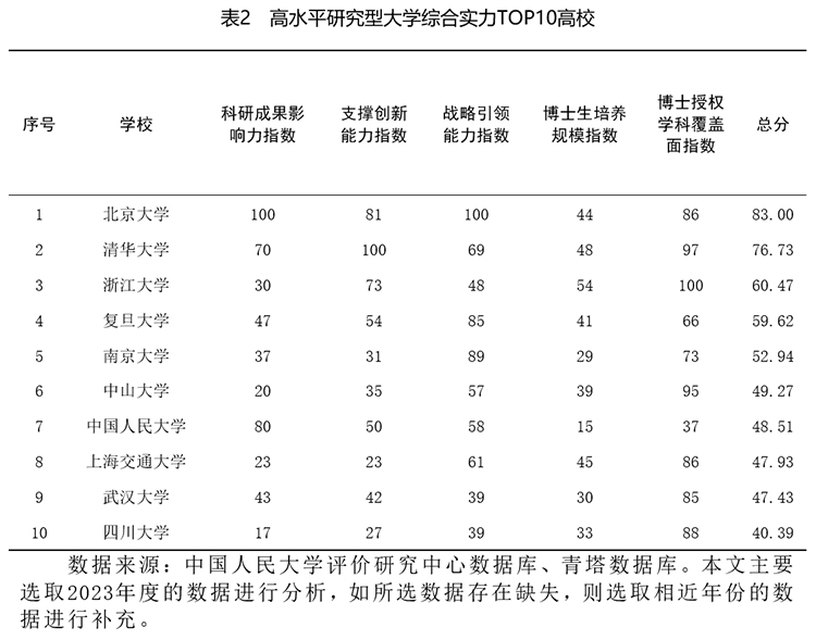 高水平研究型大學(xué)綜合得分排名前10的高校是北京大學(xué)、清華大學(xué)、浙江大學(xué)、復(fù)旦大學(xué)、南京大學(xué)、中山大學(xué)、中國人民大學(xué)、上海交通大學(xué)、武漢大學(xué)、四川大學(xué)(見表2)。從各大學(xué)在不同維度的表現(xiàn)來看,北京大學(xué)以83.00的總分位居榜首,在戰(zhàn)略引領(lǐng)能力和科研成果影響力兩個(gè)維度均獲100分,凸顯出北京大學(xué)在科研領(lǐng)域的卓越實(shí)力和持續(xù)創(chuàng)新能力。清華大學(xué)以76.73分緊隨其后,在支撐創(chuàng)新能力表現(xiàn)最佳(100分),憑借高端先進(jìn)的科研設(shè)施和高效協(xié)同的創(chuàng)新平臺(tái)搭建能力,為高難度、突破性科研項(xiàng)目提供了堅(jiān)實(shí)支撐。浙江大學(xué)以60.47分的綜合得分位列第三,學(xué)科覆蓋面得分為100分,說明學(xué)科門類較為齊全,反映出該校在學(xué)科布局的廣度和深度方面表現(xiàn)出色,為多學(xué)科交叉融合、知識(shí)創(chuàng)新與科技突破奠定了良好的基礎(chǔ)。需要指出的是,博士培養(yǎng)規(guī)模得分最高的是中國科學(xué)院大學(xué),這所以科教融合模式為特點(diǎn)的大學(xué)源于中國科學(xué)院研究生院,2012年更名為中國科學(xué)院大學(xué)。在招生培養(yǎng)方面,中國科學(xué)院博士生招生歸口中國科學(xué)院大學(xué),但培養(yǎng)過程主要在各下屬院所進(jìn)行,使得學(xué)生能夠直接參與高水平的科研項(xiàng)目[31]。2023年,中國科學(xué)院大學(xué)博士生招生人數(shù)將近8000人,是位列第二的浙江大學(xué)的兩倍。