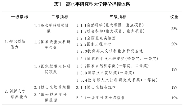 為了科學(xué)、自主地確定高水平研究型大學(xué)的評價(jià)標(biāo)準(zhǔn),本文選取評價(jià)指標(biāo)遵循如下原則。一是本土化原則。從概念模型出發(fā),高水平研究型大學(xué)是一個(gè)中國式概念,因此指標(biāo)選取應(yīng)充分考慮中國的國情與發(fā)展的需要,選取能夠反映新型舉國體制下高水平研究型大學(xué)服務(wù)國家重大需求、培養(yǎng)高層次人才與服務(wù)社會(huì)的重要指標(biāo)。二是科學(xué)性原則,在指標(biāo)的選取中突出關(guān)鍵指標(biāo)和核心特征,能夠科學(xué)準(zhǔn)確地反映高水平研究型大學(xué)的核心特征和建設(shè)目標(biāo)。每個(gè)重要領(lǐng)域應(yīng)選擇最具代表性的指標(biāo),避免指標(biāo)過多導(dǎo)致信息冗余。三是數(shù)據(jù)可采集原則,指標(biāo)數(shù)據(jù)應(yīng)具有可獲取性和準(zhǔn)確性,確保數(shù)據(jù)來源可靠、測算科學(xué)合理。