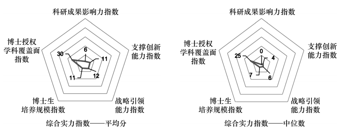 能力兩個(gè)方面均有出色表現(xiàn),但大部分重點(diǎn)高校表現(xiàn)一般。與北京大學(xué)相比(圖2),全國重點(diǎn)大學(xué)(平均分)雷達(dá)圖面積要小得多(圖3左)。北京大學(xué)的戰(zhàn)略引領(lǐng)能力指數(shù)、支撐創(chuàng)新能力指數(shù)、科研成果影響力指數(shù)、博士生培養(yǎng)規(guī)模指數(shù)、博士授權(quán)學(xué)科覆蓋面指數(shù)分別為100分、81分、100分、44分、86分;全國重點(diǎn)大學(xué)相應(yīng)指數(shù)的平均分分別為12分、11分、6分、11分、30分,如果用中位數(shù)(圖3右)則分別為6分、4分、0分、7分、25分,差距更大。這反映出中國重點(diǎn)大學(xué)大部分尚不具備高水平研究型大學(xué)的特點(diǎn),建設(shè)一批高水平研究型大學(xué)是第三輪“雙一流”建設(shè)的首要任務(wù)。
