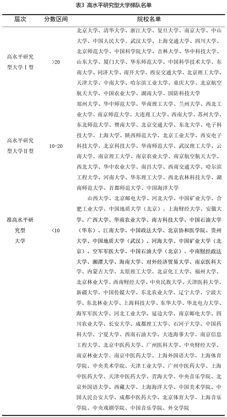 基于綜合得分情況,本文將148所高校劃分為高水平研究型大學(xué)I型(31所)、高水平研究型大學(xué)Ⅱ型(共計(jì)36所)、準(zhǔn)高水平研究型大學(xué)(共計(jì)81所),形成“頂尖引領(lǐng)一中堅(jiān)支撐—基礎(chǔ)托底”的梯次結(jié)構(gòu)(見表3)。
