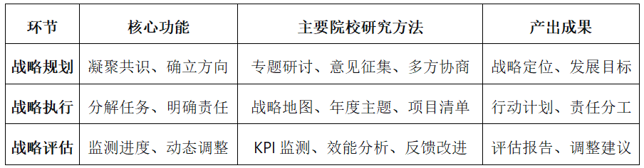 其二,戰(zhàn)略執(zhí)行明確任務(wù)分解與協(xié)同責(zé)任。戰(zhàn)略引領(lǐng)機(jī)制的關(guān)鍵突破在于將宏觀戰(zhàn)略轉(zhuǎn)化為可操作、可衡量的具體行動(dòng)。院校研究團(tuán)隊(duì)運(yùn)用戰(zhàn)略地圖等工具,將總體目標(biāo)系統(tǒng)分解為關(guān)鍵績(jī)效指標(biāo),并協(xié)同各職能部門(mén)制定年度主題與項(xiàng)目清單,形成清晰的“目標(biāo)—任務(wù)—責(zé)任”矩陣。在此過(guò)程中,IR人員深入各執(zhí)行單元,提供方法論指導(dǎo)與數(shù)據(jù)分析支持,幫助各部門(mén)理解自身工作在戰(zhàn)略全局中的定位,有效破解了傳統(tǒng)戰(zhàn)略管理中的傳導(dǎo)障礙。