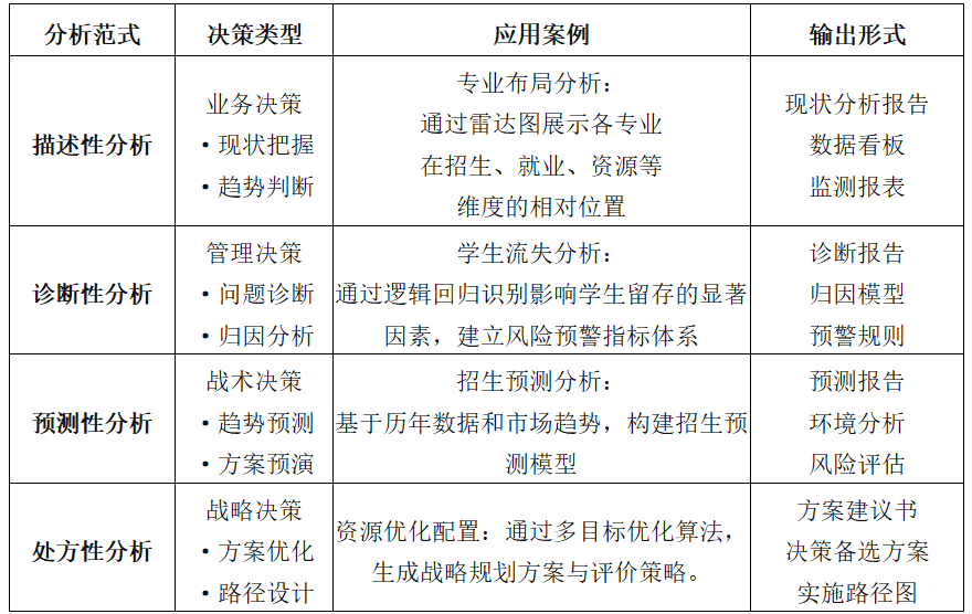 其三,院校研究分析范式逐步實(shí)現(xiàn)專業(yè)化進(jìn)階。從描述性分析、診斷性分析,到預(yù)測(cè)性分析與處方性分析,院校研究人員協(xié)同技術(shù)人員通過(guò)學(xué)業(yè)預(yù)警模型構(gòu)建、招生預(yù)測(cè)系統(tǒng)開(kāi)發(fā)、資源優(yōu)化算法設(shè)計(jì)等實(shí)踐項(xiàng)目,在解決實(shí)際問(wèn)題中實(shí)現(xiàn)分析能力的持續(xù)進(jìn)階。