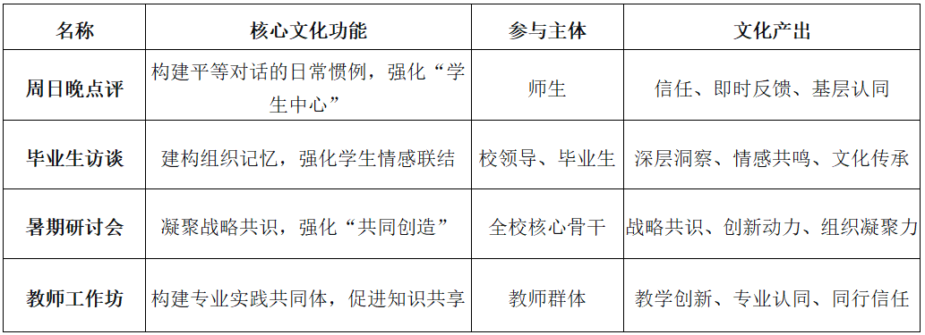 文化賦能機(jī)制構(gòu)成“共同創(chuàng)造”模式的深層支撐,通過(guò)系統(tǒng)化的文化建構(gòu)與制度性交流實(shí)踐,營(yíng)造尊重專業(yè)價(jià)值、激勵(lì)協(xié)同創(chuàng)新的組織氛圍。時(shí)任校長(zhǎng)劉獻(xiàn)君高度重視文化在院校研究中的基礎(chǔ)性作用,提出“共同目標(biāo)、共同創(chuàng)造、共同發(fā)展”的組織文化,在他的推動(dòng)下,文華學(xué)院建立了包括“周日晚點(diǎn)評(píng)”、“畢業(yè)生深度訪談”等在內(nèi)的制度性交流體系,為“共同創(chuàng)造”模式提供了深厚的文化支撐。
