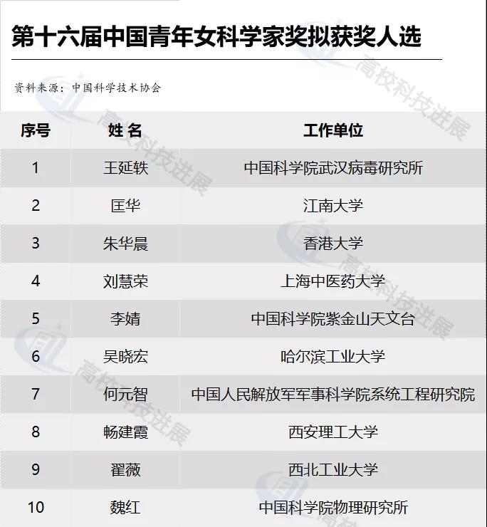 據(jù)中國(guó)科學(xué)技術(shù)協(xié)會(huì)官網(wǎng)日前對(duì)外公示的第十六屆中國(guó)青年女科學(xué)家獎(jiǎng)、2019年度未來(lái)女科學(xué)家計(jì)劃擬獲獎(jiǎng)名單顯示,本次共有9位高校女科學(xué)家,3個(gè)高校女科學(xué)家作為負(fù)責(zé)人的團(tuán)隊(duì)入圍擬獲獎(jiǎng)名單。