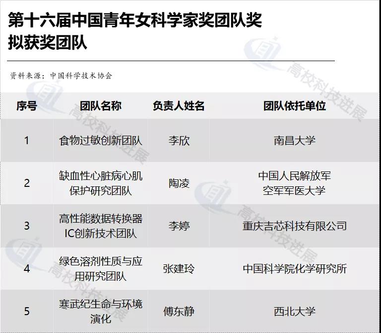 南昌大學(xué)、中國(guó)人民解放軍空軍軍醫(yī)大學(xué)和西北大學(xué),各有1個(gè)團(tuán)隊(duì)入圍第十六屆“中國(guó)青年女科學(xué)家獎(jiǎng)團(tuán)隊(duì)獎(jiǎng)”擬獲獎(jiǎng)團(tuán)隊(duì)。擬獲獎(jiǎng)團(tuán)隊(duì)分別為:以南昌大學(xué)李欣教授為負(fù)責(zé)人的食物過(guò)敏創(chuàng)新團(tuán)隊(duì)、以中國(guó)人民解放軍空軍軍醫(yī)大學(xué)陶凌教授為負(fù)責(zé)人的缺血性心臟病心肌保護(hù)研究團(tuán)隊(duì)、以西北大學(xué)傅東靜為負(fù)責(zé)人的寒武紀(jì)生命與環(huán)境演化團(tuán)隊(duì)。