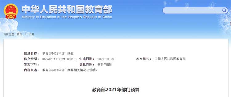 3月25日,教育部官方網(wǎng)站公布了教育部2021年部門預(yù)算。預(yù)算文件顯示,教育部2021年部門預(yù)算一般公共預(yù)算當(dāng)年財政撥款為13,420,942.24萬元,比2020年執(zhí)行數(shù)減少673,589.47萬元。
