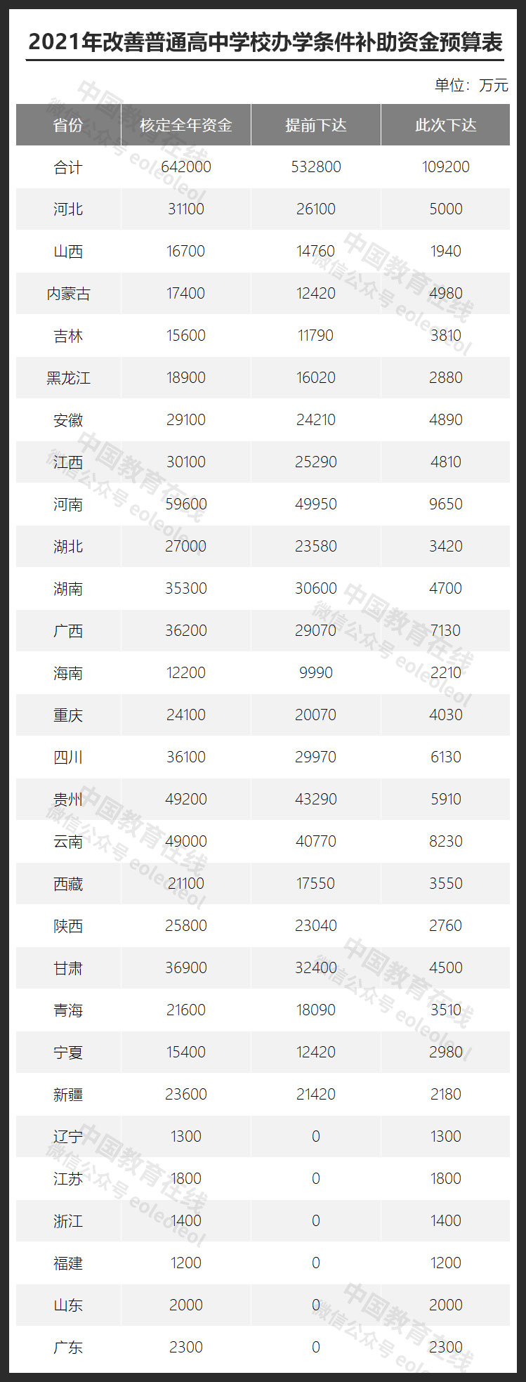 近日,財(cái)政部、教育部聯(lián)合印發(fā)《關(guān)于下達(dá)2021年改善普通高中學(xué)校辦學(xué)條件補(bǔ)助資金預(yù)算的通知》(以下簡稱《通知》),本次向各省(自治區(qū)、直轄市)下達(dá)改善普通高中學(xué)校辦學(xué)條件補(bǔ)助資金預(yù)算合計(jì)10.92億元,此前已提前下達(dá)53.28億元,共計(jì)64.2億元。