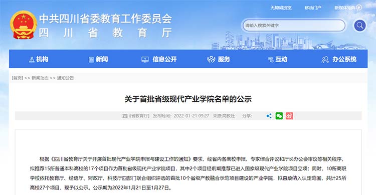 根據(jù)《四川省教育廳關(guān)于開(kāi)展首批現(xiàn)代產(chǎn)業(yè)學(xué)院申報(bào)與建設(shè)工作的通知》要求,經(jīng)省內(nèi)各高校申報(bào)、專(zhuān)家綜合評(píng)議和廳長(zhǎng)辦公會(huì)審議等相關(guān)程序,擬推薦15所普通本科高校的17個(gè)項(xiàng)目作為首批省級(jí)現(xiàn)代產(chǎn)業(yè)學(xué)院項(xiàng)目,其中2個(gè)項(xiàng)目經(jīng)前期推薦已進(jìn)入國(guó)家級(jí)現(xiàn)代產(chǎn)業(yè)學(xué)院項(xiàng)目立項(xiàng);同時(shí),10所高職學(xué)校依托教育廳、經(jīng)信廳、財(cái)政廳、科技廳四部門(mén)聯(lián)合組織評(píng)選的首批10個(gè)省級(jí)產(chǎn)教融合示范項(xiàng)目建設(shè)的產(chǎn)業(yè)學(xué)院,擬直接納入認(rèn)定范圍。公示期為2022年1月21日至1月27日。