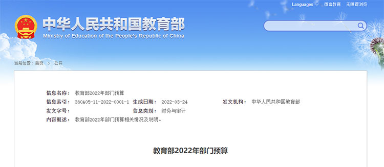 3月24日,教育部官方網(wǎng)站公布了教育部2022年部門預算。預算文件顯示,教育部2022年部門預算中一般公共預算當年財政撥款為 13,794,401.91 萬元,比 2021年執(zhí)行數(shù)增加 122,413.70 萬元。