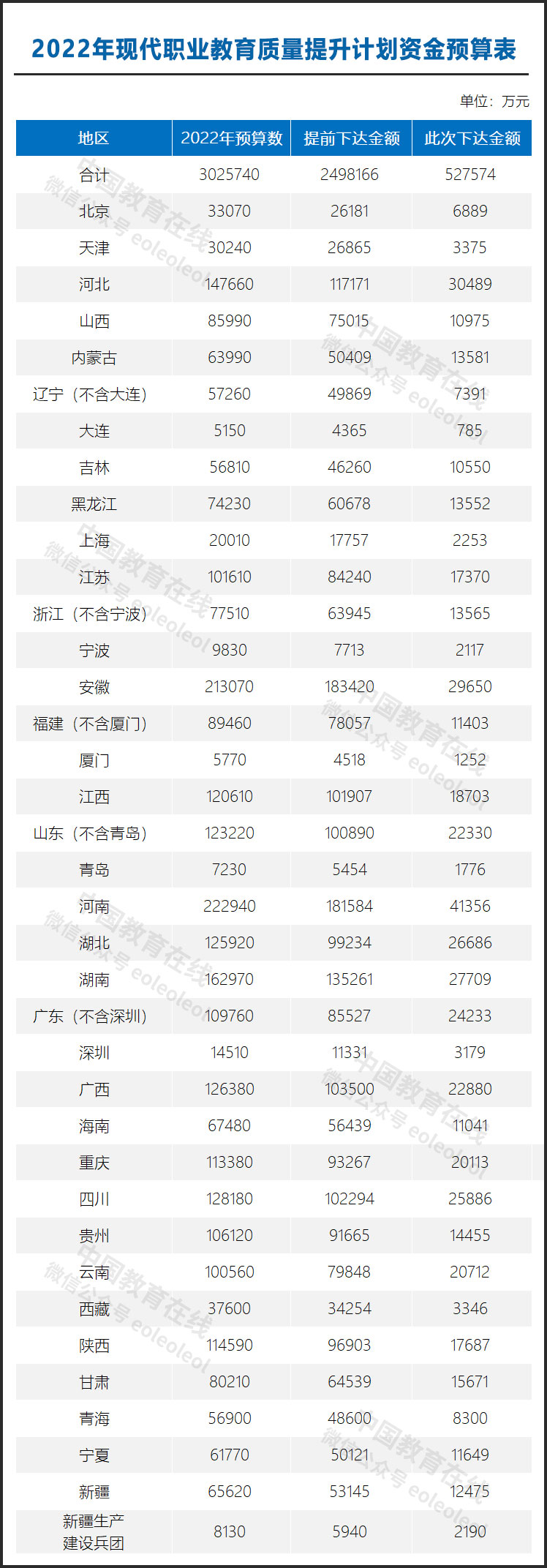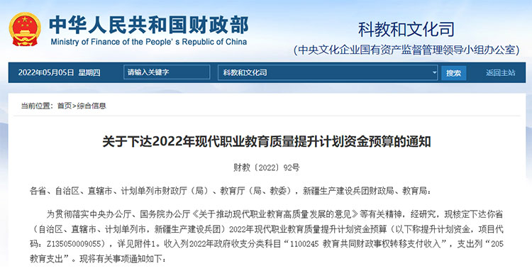 近日,財政部、教育部發(fā)布《關(guān)于下達2022年現(xiàn)代職業(yè)教育質(zhì)量提升計劃資金預算的通知》(以下簡稱“通知”)。此次下達的2022年現(xiàn)代職業(yè)教育質(zhì)量提升計劃資金預算金額為52.76億元,加上已提前下達金額249.81億元,目前累計下達預算為302.57億元。