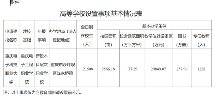 10月8日,重慶市教育委員會對高等學(xué)校設(shè)置事項進(jìn)行公示:根據(jù)《中華人民共和國高等教育法》《普通高等學(xué)校設(shè)置暫行條例》《本科層次職業(yè)學(xué)校設(shè)置標(biāo)準(zhǔn)(試行)》等有關(guān)規(guī)定要求,經(jīng)市高校設(shè)置評議委員會專家考察和評議,擬向教育部申報設(shè)置重慶電子科技職業(yè)大學(xué)。