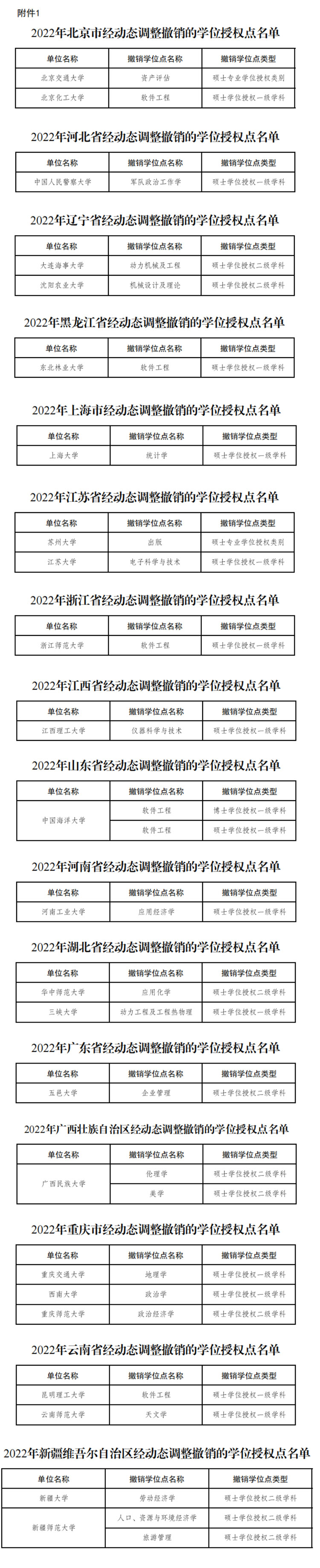 2022年經(jīng)動(dòng)態(tài)調(diào)整撤銷(xiāo)的學(xué)位授權(quán)點(diǎn)名單(分省)