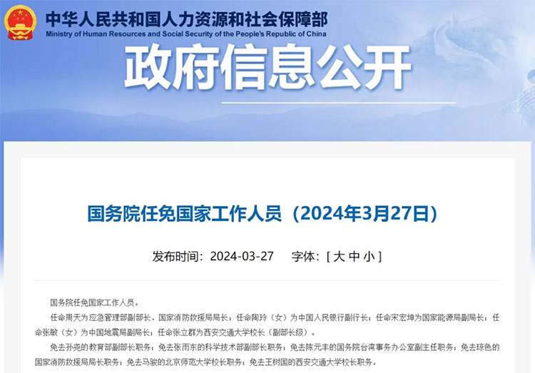 任命周天為應急管理部副部長、國家消防救援局局長;任命陶玲(女)為中國人民銀行副行長;任命宋宏坤為國家能源局副局長;任命張敏(女)為中國地震局副局長;任命張立群為西安交通大學校長(副部長級)。
