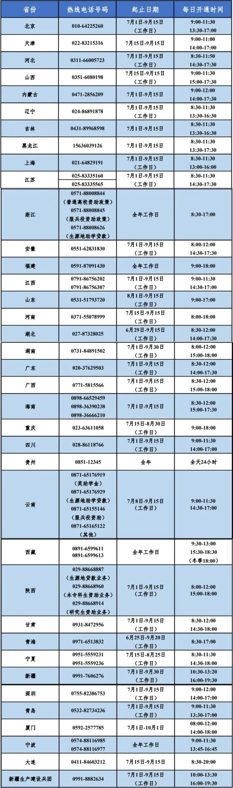 同時,各省(自治區(qū)、直轄市)和中央高校同步開通熱線電話,電話號碼與每日開通時間如下。