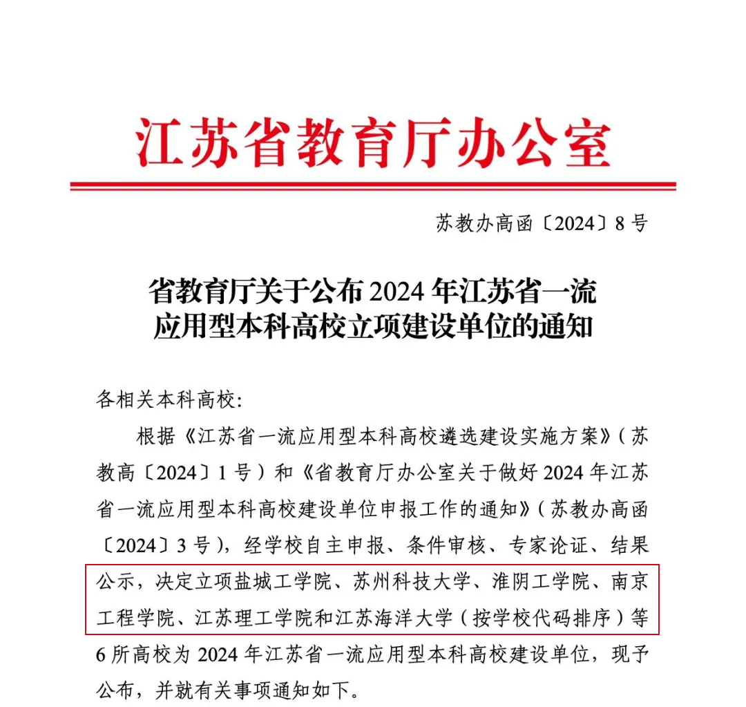 近日,江蘇省教育廳發(fā)布了《省教育廳關(guān)于公布2024年江蘇省一流應用型本科高校立項建設單位的通知》(蘇教辦高函〔2024〕8號),經(jīng)學校自主申報、條件審核、專家論證、結(jié)果公示,決定立項鹽城工學院、蘇州科技大學、淮陰工學院、南京工程學院、江蘇理工學院和江蘇海洋大學6所高校為2024年江蘇省一流應用型本科高校建設單位。