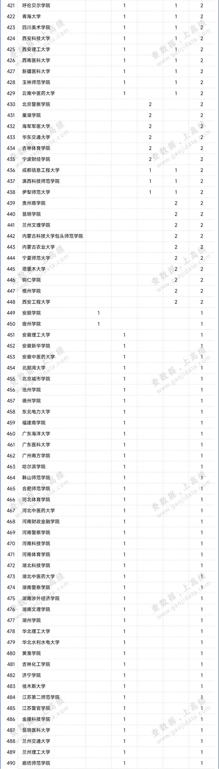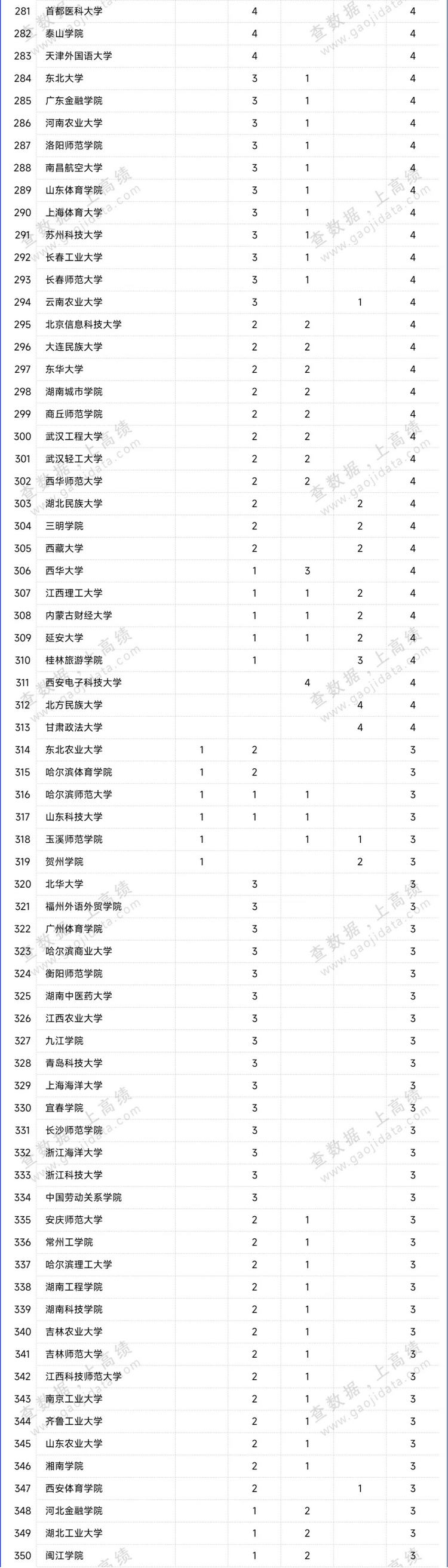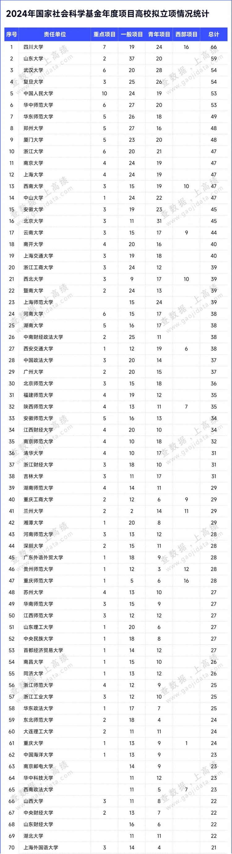 據(jù)統(tǒng)計(jì),共有587所高校擬入選。四川大學(xué)以66項(xiàng)的擬立項(xiàng)數(shù)位居榜首,山東大學(xué)以擬立項(xiàng)數(shù)59項(xiàng)位居全國第二位,武漢大學(xué)和復(fù)旦大學(xué)以54項(xiàng)的擬立項(xiàng)數(shù)并列第三。中國人民大學(xué)、華中師范大學(xué)、華東師范大學(xué)、鄭州大學(xué)、廈門大學(xué)、浙江大學(xué)、南京大學(xué)、上海大學(xué)、西南大學(xué)、中山大學(xué)、安徽大學(xué)、北京大學(xué)等高校的擬立項(xiàng)數(shù)量≥45項(xiàng)。