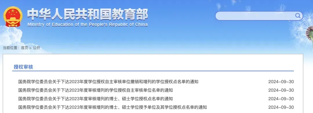 近日,教育部官網(wǎng)公開國務院學位委員會關(guān)于下達2023年度學位授權(quán)自主審核單位撤銷和增列的學位授權(quán)點名單和2023年度審核增列的學位授權(quán)自主審核單位名單的通知。