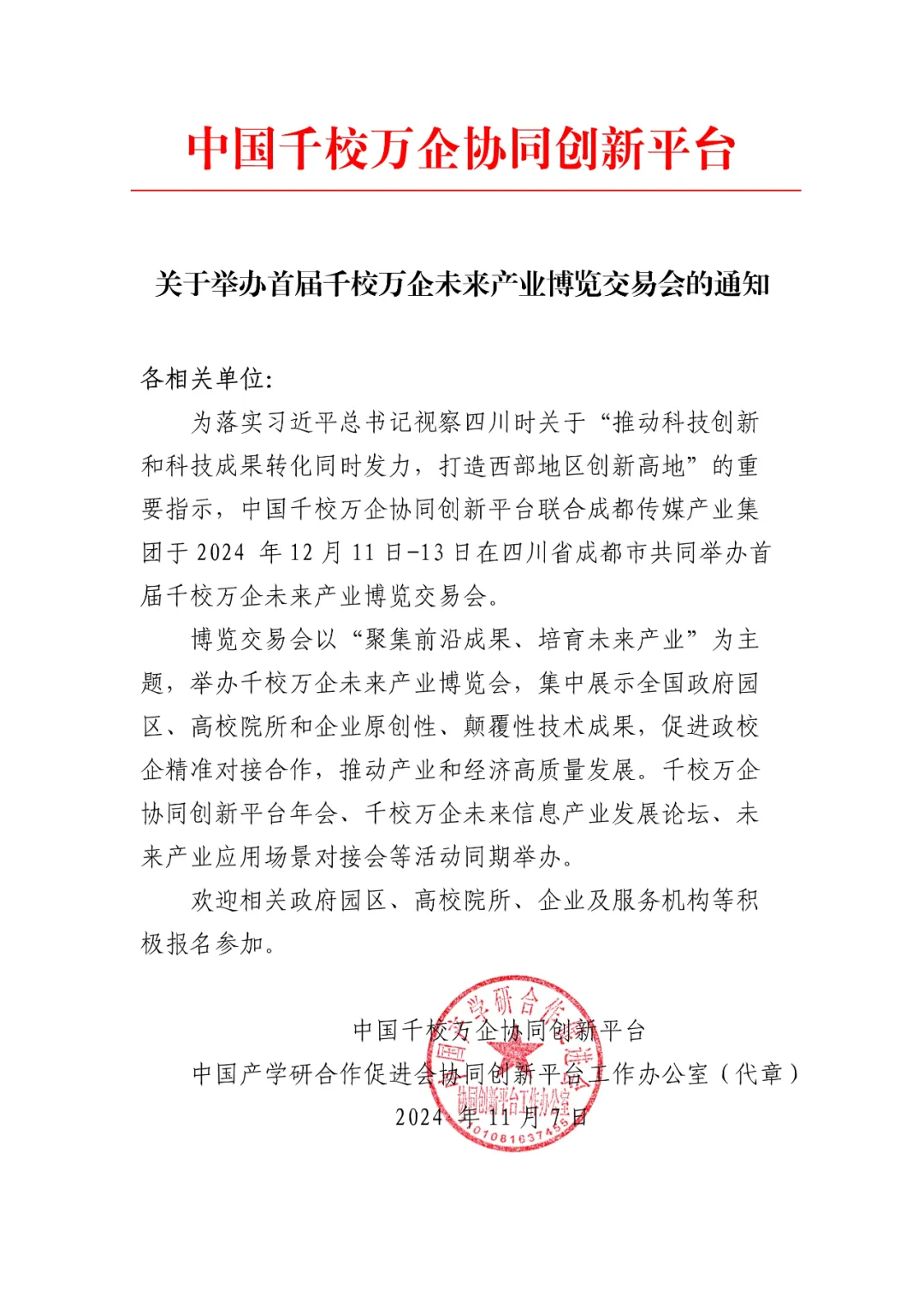為落實習(xí)近平總書記視察四川時關(guān)于“推動科技創(chuàng)新和科技成果轉(zhuǎn)化同時發(fā)力,打造西部地區(qū)創(chuàng)新高地”的重要指示,中國千校萬企協(xié)同創(chuàng)新平臺聯(lián)合成都傳媒產(chǎn)業(yè)集團于2024年12月11日-13日在四川省成都市共同舉辦首屆千校萬企未來產(chǎn)業(yè)博覽交易會。