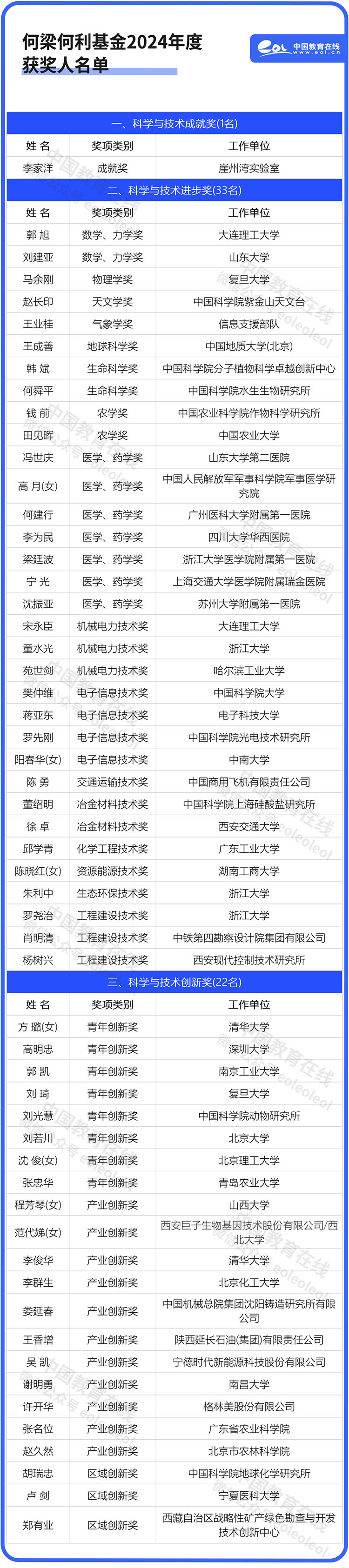 據(jù)介紹,何梁何利基金是香港愛國(guó)金融實(shí)業(yè)家何善衡、梁銶琚、何添、利國(guó)偉先生于1994年3月30日捐資創(chuàng)立的、以獎(jiǎng)勵(lì)中華人民共和國(guó)杰出科技工作者為宗旨的科技獎(jiǎng)勵(lì)基金。2024年度有1名為我國(guó)科技進(jìn)步與創(chuàng)新作出卓越貢獻(xiàn)的杰出科技工作者,榮獲“何梁何利基金科學(xué)與技術(shù)成就獎(jiǎng)”,授予證書、獎(jiǎng)金100萬(wàn)港元;33名在科學(xué)技術(shù)領(lǐng)域取得重大發(fā)明、發(fā)現(xiàn)和科技成果的優(yōu)秀科技工作者,榮獲“何梁何利基金科學(xué)與技術(shù)進(jìn)步獎(jiǎng)”,各授予證書、獎(jiǎng)金20萬(wàn)港元;22名具有高水平科技成就,通過(guò)技術(shù)創(chuàng)新和管理創(chuàng)新,創(chuàng)造重大經(jīng)濟(jì)效益和社會(huì)效益的優(yōu)秀科技工作者,榮獲“何梁何利基金科學(xué)與技術(shù)創(chuàng)新獎(jiǎng)”,各授予證書、獎(jiǎng)金20萬(wàn)港元。