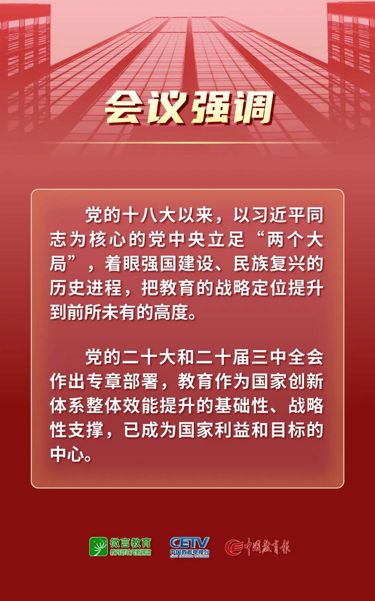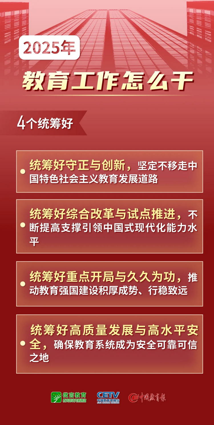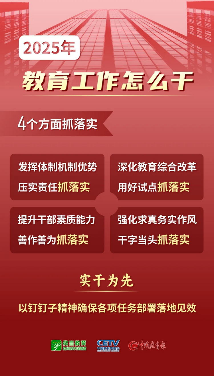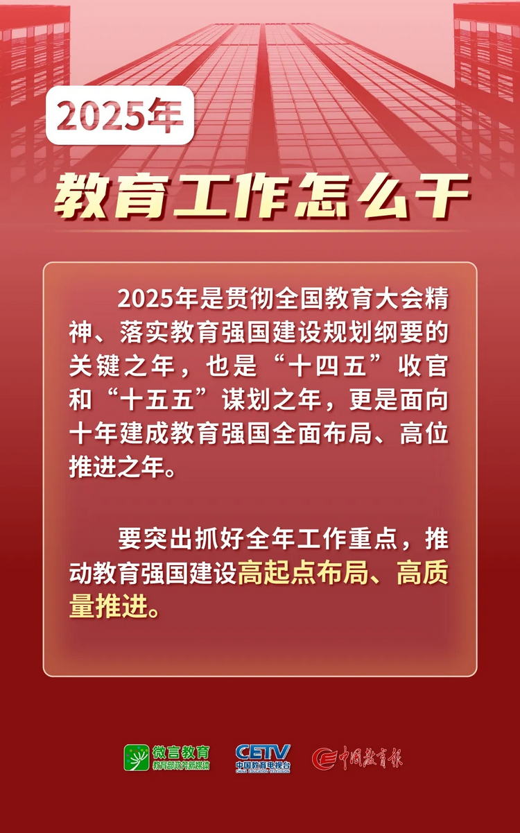 1月9日—10日,2025年全國(guó)教育工作會(huì)議在北京舉行。會(huì)議以習(xí)近平新時(shí)代中國(guó)特色社會(huì)主義思想為指導(dǎo),全面貫徹落實(shí)黨的二十大和二十屆二中、三中全會(huì)精神,深入學(xué)習(xí)貫徹全國(guó)教育大會(huì)精神和習(xí)近平總書記關(guān)于教育的重要論述,總結(jié)工作、分析形勢(shì),統(tǒng)一思想、凝聚共識(shí),圍繞組織實(shí)施教育強(qiáng)國(guó)建設(shè)規(guī)劃綱要,安排布置年度重點(diǎn)任務(wù),確保教育強(qiáng)國(guó)建設(shè)高起點(diǎn)布局、高質(zhì)量推進(jìn)。會(huì)上說(shuō)了啥,組圖為你劃重點(diǎn)——