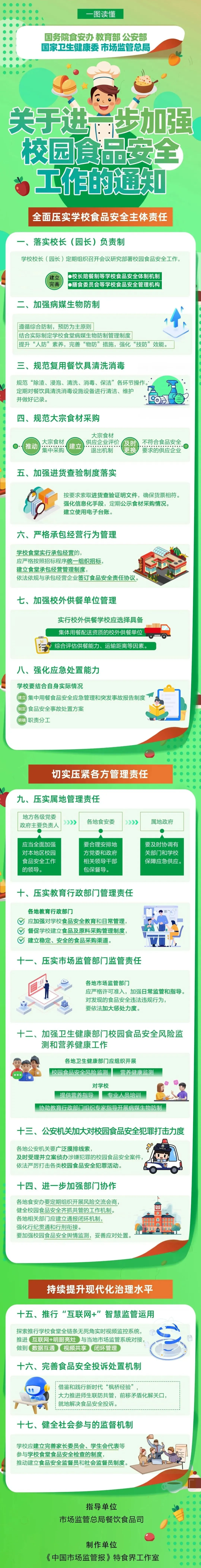 近日,國務院食安辦聯(lián)合教育部、公安部、國家衛(wèi)生健康委、市場監(jiān)管總局印發(fā)《關于進一步加強校園食品安全工作的通知》(以下簡稱《通知》),聚焦校園食品安全主體責任、管理責任和現(xiàn)代化治理水平,部署各地進一步健全校園食品安全全鏈條防控風險的制度機制,強化校園食品安全保障。