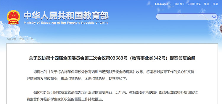 近日,教育部網(wǎng)站發(fā)布“對第十四屆全國委員會第二次會議第03683號提案的答復(fù)”,在答復(fù)“關(guān)于綜合施策保障校外教育培訓(xùn)市場預(yù)付費安全的提案”時,教育部表示,用好“黑白名單”制度,將培訓(xùn)預(yù)收費情況作為校外培訓(xùn)機構(gòu)誠信建設(shè)的重要內(nèi)容,依法依規(guī)嚴厲懲治違法失信行為,著力防范化解風(fēng)險,切實維護人民群眾的合法權(quán)益。