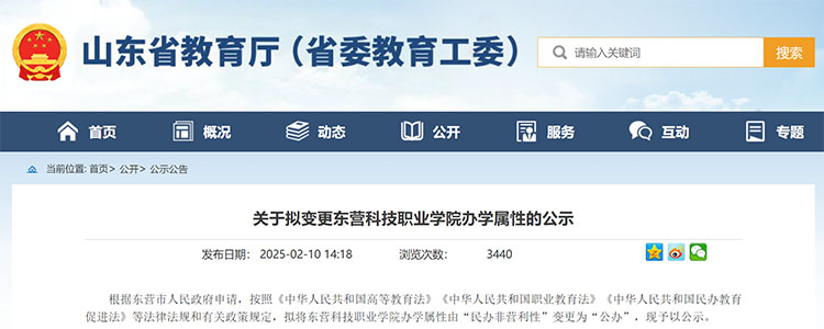 2月10日,山東省教育廳網(wǎng)站發(fā)布《關(guān)于擬變更東營科技職業(yè)學(xué)院辦學(xué)屬性的公示》,擬將東營科技職業(yè)學(xué)院辦學(xué)屬性由“民辦非營利性”變更為“公辦”。