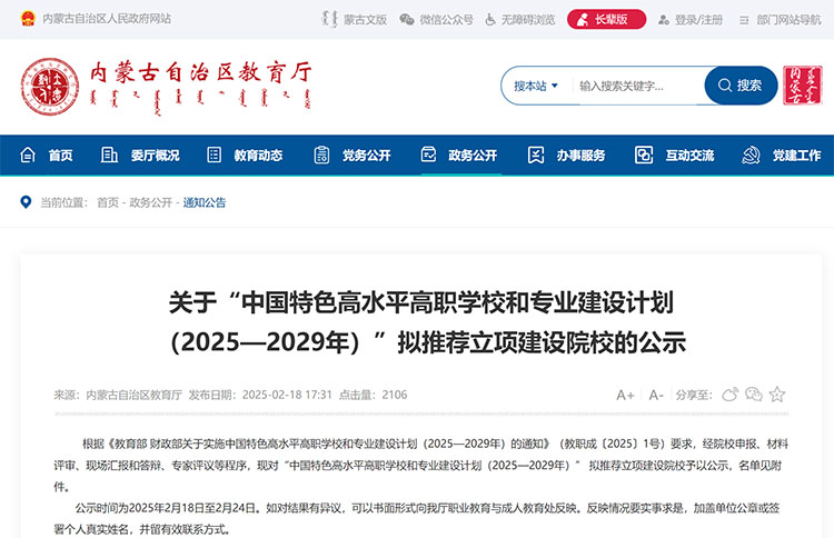 2月19日,內(nèi)蒙古自治區(qū)教育廳發(fā)布《關(guān)于“中國特色高水平高職學(xué)校和專業(yè)建設(shè)計劃(2025—2029年)”擬推薦立項建設(shè)院校的公示》。