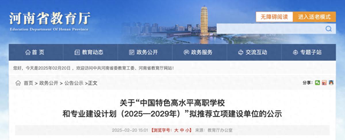 2月20日,河南省教育廳發(fā)布《關(guān)于“中國特色高水平高職學(xué)校和專業(yè)建設(shè)計(jì)劃(2025—2029年)”擬推薦立項(xiàng)建設(shè)單位的公示》。