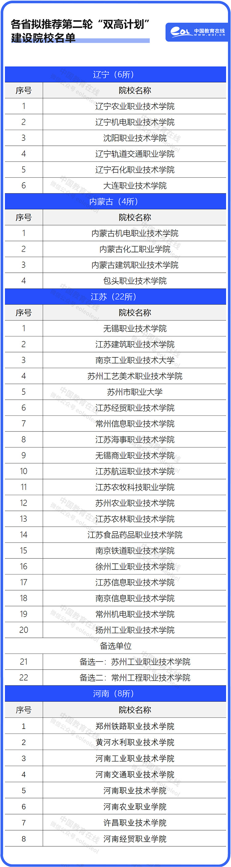 除河南外,近期,江蘇、遼寧、內(nèi)蒙古等地也公示了第二輪國家“雙高計(jì)劃”推薦名單。截至目前,已有40所院校(含備選)擬獲推薦進(jìn)入新一輪“雙高計(jì)劃”建設(shè)名單。