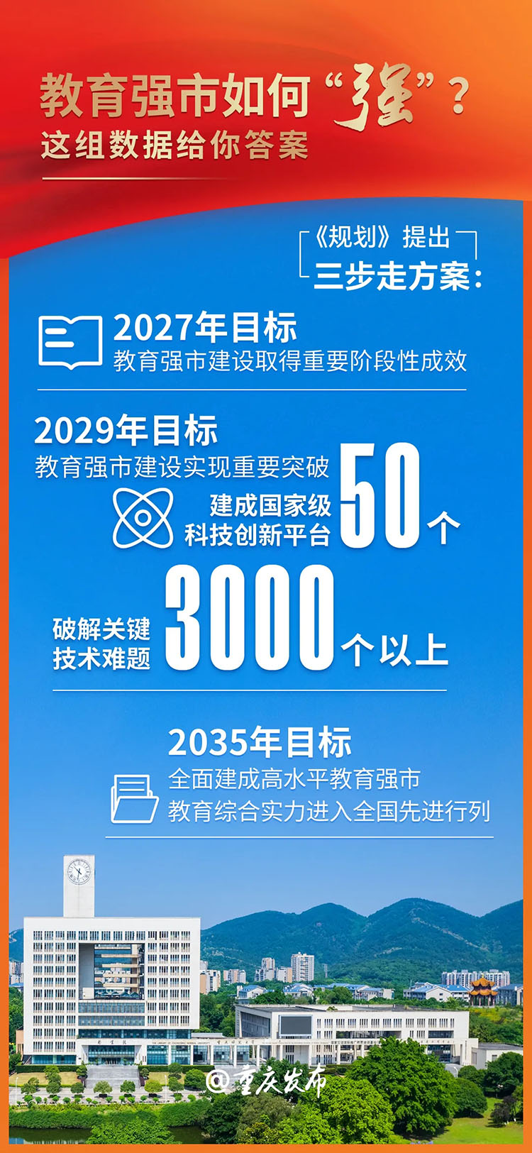 2月27日,重慶市政府新聞辦舉行《重慶加快建設(shè)教育強市 推進教育現(xiàn)代化規(guī)劃(2024—2035年)》新聞發(fā)布會。會上,市教委就《規(guī)劃》介紹了相關(guān)情況,明確了《規(guī)劃》的總體要求、主要任務(wù)、組織實施。重慶如何打造教育強市?一組數(shù)據(jù)給你答案。
