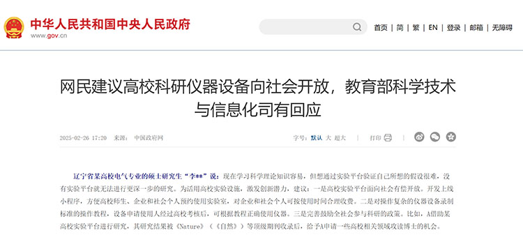 近日,有網(wǎng)友在中國(guó)政府網(wǎng)上留言,建議高校實(shí)驗(yàn)平臺(tái)和科研儀器設(shè)備向社會(huì)開放。2月26日,教育部科學(xué)技術(shù)與信息化司回復(fù)稱,教育部歷來(lái)高度重視推動(dòng)高校重大科研基礎(chǔ)設(shè)施和大型科研儀器設(shè)備全面開放、充分共享。目前,31個(gè)?。ㄗ灾螀^(qū)、直轄市)342家中央級(jí)高校和科研院所建立了在線服務(wù)平臺(tái)并按照統(tǒng)一的標(biāo)準(zhǔn)規(guī)范與重大科研基礎(chǔ)設(shè)施和大型科研儀器國(guó)家網(wǎng)絡(luò)管理平臺(tái)互聯(lián)對(duì)接,14.1萬(wàn)臺(tái)(套)原值50萬(wàn)元及以上的大型科研儀器已納入平臺(tái)開放共享。