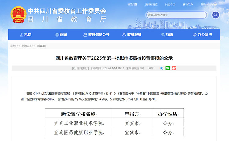 近日,四川省教育廳發(fā)布關(guān)于2025年第一批擬申報(bào)高校設(shè)置事項(xiàng)的公示,擬設(shè)立宜賓工業(yè)職業(yè)技術(shù)學(xué)院、宜賓醫(yī)藥健康職業(yè)學(xué)院。公示信息顯示,兩所學(xué)校的辦學(xué)性質(zhì)均為公辦 ,申報(bào)方為宜賓市。