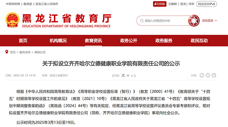 3月12日,黑龍江省教育廳發(fā)布《關于擬設立齊齊哈爾立德健康職業(yè)學院有限責任公司的公示》,對擬設置齊齊哈爾立德健康職業(yè)學院有限責任公司(簡稱,齊齊哈爾立德健康職業(yè)學院)事項向社會公示。