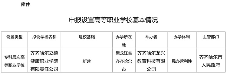 黑龍江擬設立齊齊哈爾立德健康職業(yè)學院有限責任公司