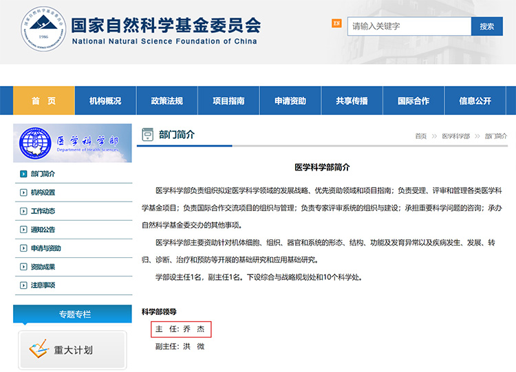 國(guó)家自然科學(xué)基金委員會(huì)官方網(wǎng)站顯示,喬杰院士已擔(dān)任國(guó)家自然科學(xué)基金委員會(huì)醫(yī)學(xué)科學(xué)部主任。