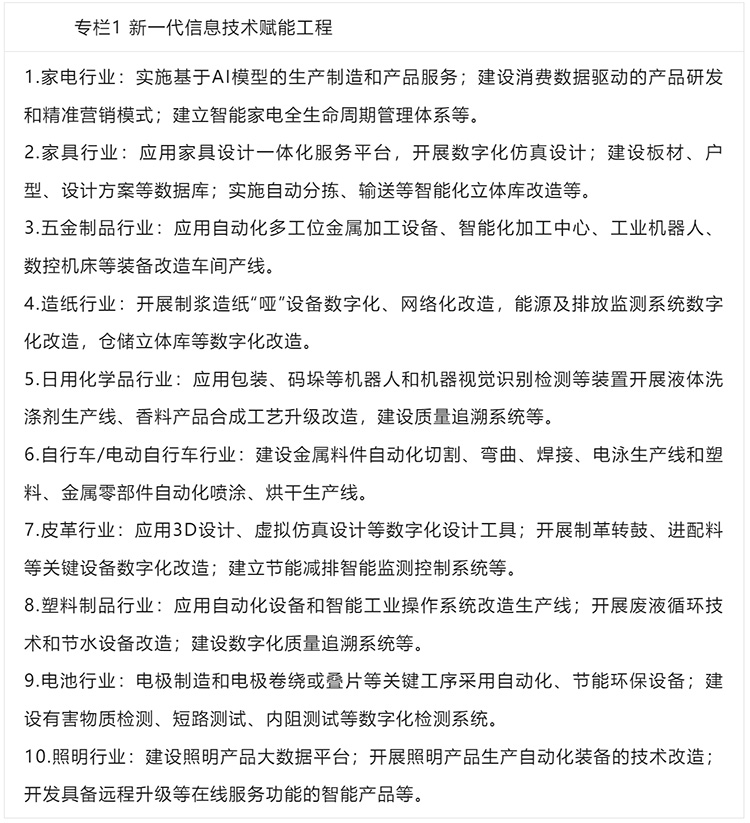 2.加快智能化升級。引導輕工業(yè)開展智能制造能力成熟度、中小企業(yè)數字化水平評測等評估診斷,梯次開展數字化、智能化改造。推動五金制品、塑料制品、文體用品、眼鏡等行業(yè)中小企業(yè)實施精益管理,應用傳感器、工控系統(tǒng)等開展關鍵工序、制造單元等數字化“微改造”,建設數字化產線。支持家電、家具、皮革、造紙、日用化學品等行業(yè)數字化基礎好的企業(yè),開展智能裝備和工業(yè)系統(tǒng)的集成化改造,培育一批數字化車間、智能工廠、5G工廠。