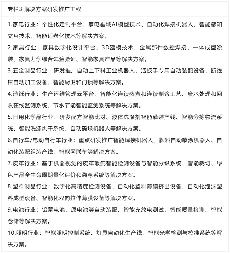 5.壯大服務隊伍。依托智能制造系統(tǒng)解決方案揭榜掛帥、供應商能力評估等工作機制,遴選發(fā)布一批優(yōu)質數字化轉型供應商。面向家電、家具、五金等離散型輕工業(yè)研發(fā)推廣智能排產、自動化裝配組裝、智能倉儲等解決方案。面向造紙、日用化學品等流程型輕工業(yè)研發(fā)推廣智能配方設計、質量在線監(jiān)測、設備預防性維護等解決方案。面向中小企業(yè)研發(fā)推廣一批“小快輕準”的解決方案。
