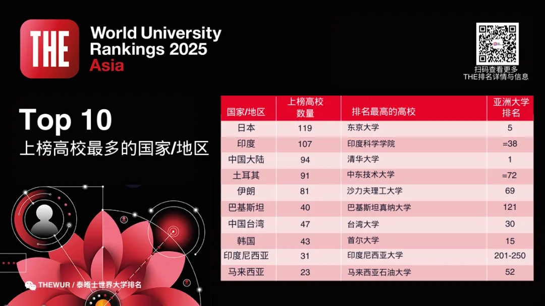 在2025 年泰晤士高等教育亞洲大學排名中,中國大陸高校獨占鰲頭,清華大學第七年蟬聯(lián)第一,五所中國大陸高校進入前十名,上榜高校中有近三分之一的排名有所提升。
