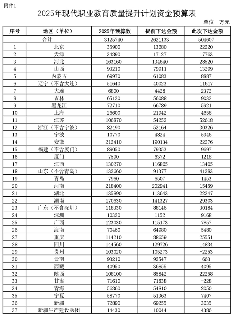5月19日,財政部、教育部發(fā)布《關(guān)于下達(dá)2025年現(xiàn)代職業(yè)教育質(zhì)量提升計劃資金預(yù)算的通知》(下簡稱《通知》)。據(jù)《2025年現(xiàn)代職業(yè)教育質(zhì)量提升計劃資金預(yù)算表》顯示,2025年預(yù)算數(shù)合計312.57億元,提前下達(dá)金額262.11億元,此次下達(dá)金額50.46億元。