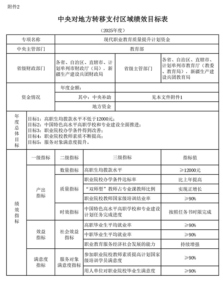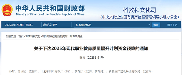 關(guān)于下達(dá)2025年現(xiàn)代職業(yè)教育質(zhì)量提升計劃資金預(yù)算的通知 財教〔2025〕91號