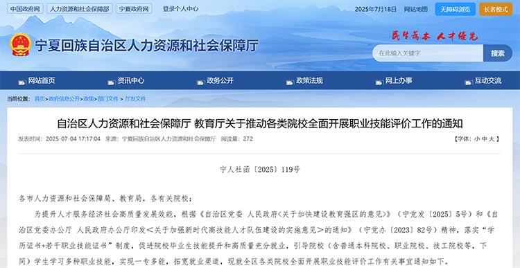 為提升人才服務經(jīng)濟社會高質量發(fā)展效能,根據(jù)《自治區(qū)黨委 人民政府<關于加快建設教育強區(qū)的意見>》(寧黨發(fā)〔2025〕5號)和《自治區(qū)黨委辦公廳 人民政府辦公廳印發(fā)<關于加強新時代高技能人才隊伍建設的實施意見>的通知》(寧黨辦〔2023〕82號)精神,落實“學歷證書+若干職業(yè)技能證書”制度,促進院校畢業(yè)生技能提升和高質量充分就業(yè),引導院校(含普通本科院校、職業(yè)院校、技工院校等,下同)學生學習多種職業(yè)技能,實現(xiàn)一專多能,拓寬就業(yè)渠道,現(xiàn)就全區(qū)各類院校全面開展職業(yè)技能評價工作有關事宜通知如下。